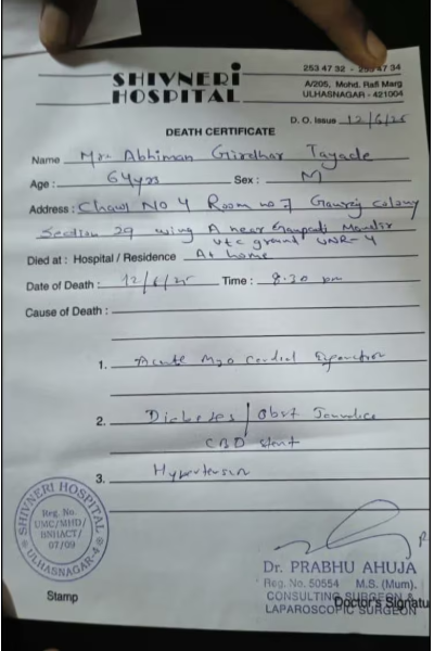 மகாராஷ்டிரா மாநிலம் உல்ஹாஸ் நகரைச் சேர்ந்தவர் அபிமன் கிர்தர் தயாடே. 64 வயதான இவர் நீரிழிவு, மஞ்சள் காமாலை மற்றும் பிற உடல்நலக் குறைபாடுகளால் கடந்த 12ஆம் திகதி மயக்கமடைந்தார்.