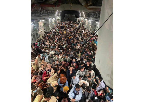 அதன் படி காபூல் விமானநிலையத்தில், இருந்த அமெரிக்க இராணுவ சரக்கு விமானத்தில்(C-17 Globemaster III) சுமார் 600-க்கும் மேற்பட்ட ஆப்கானியர்கள் கடும் நெருக்கடியுடன் அமர்ந்திருக்கும் புகைப்படம் வெளியாகியிருந்தது.