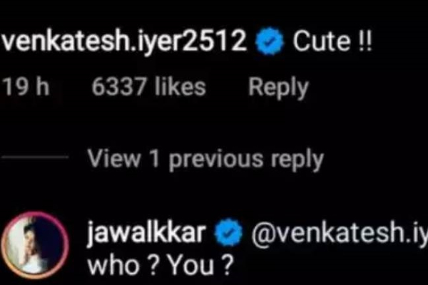 இந்நிலையில் பிரபல தெலுங்கு நடிகையான ப்ரியங்கா ஜவல்கர், இன்ஸ்டாகிராம் பக்கத்தில் தனது புகைப்படத்தை வெளியிட்டார். அந்த புகைப்படத்திற்கு ”கியூட்” என கமெண்ட் செய்தார் வெங்கடேஷ் ஐயர்.