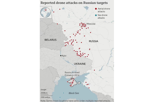 உக்ரைனின் எதிர்ப்பு தாக்குதல் தொடங்குவதாக உக்ரைன் அறிவித்ததில் இருந்து ரஷ்யா மற்றும் கிரிமியாவின் பல பகுதிகளில் உக்ரைன் தொடர் ட்ரோன் தாக்குதலை நடத்தி வருகிறது.